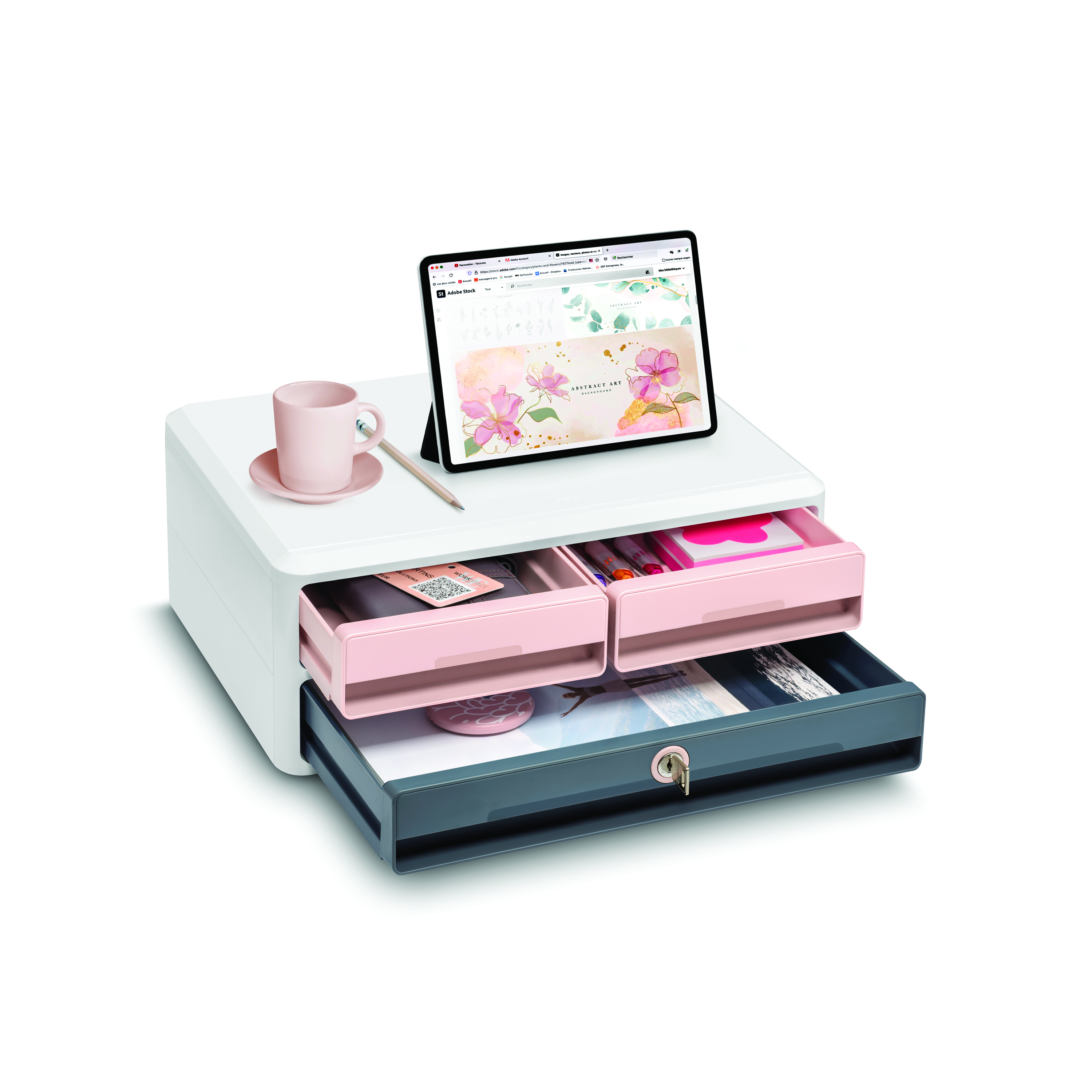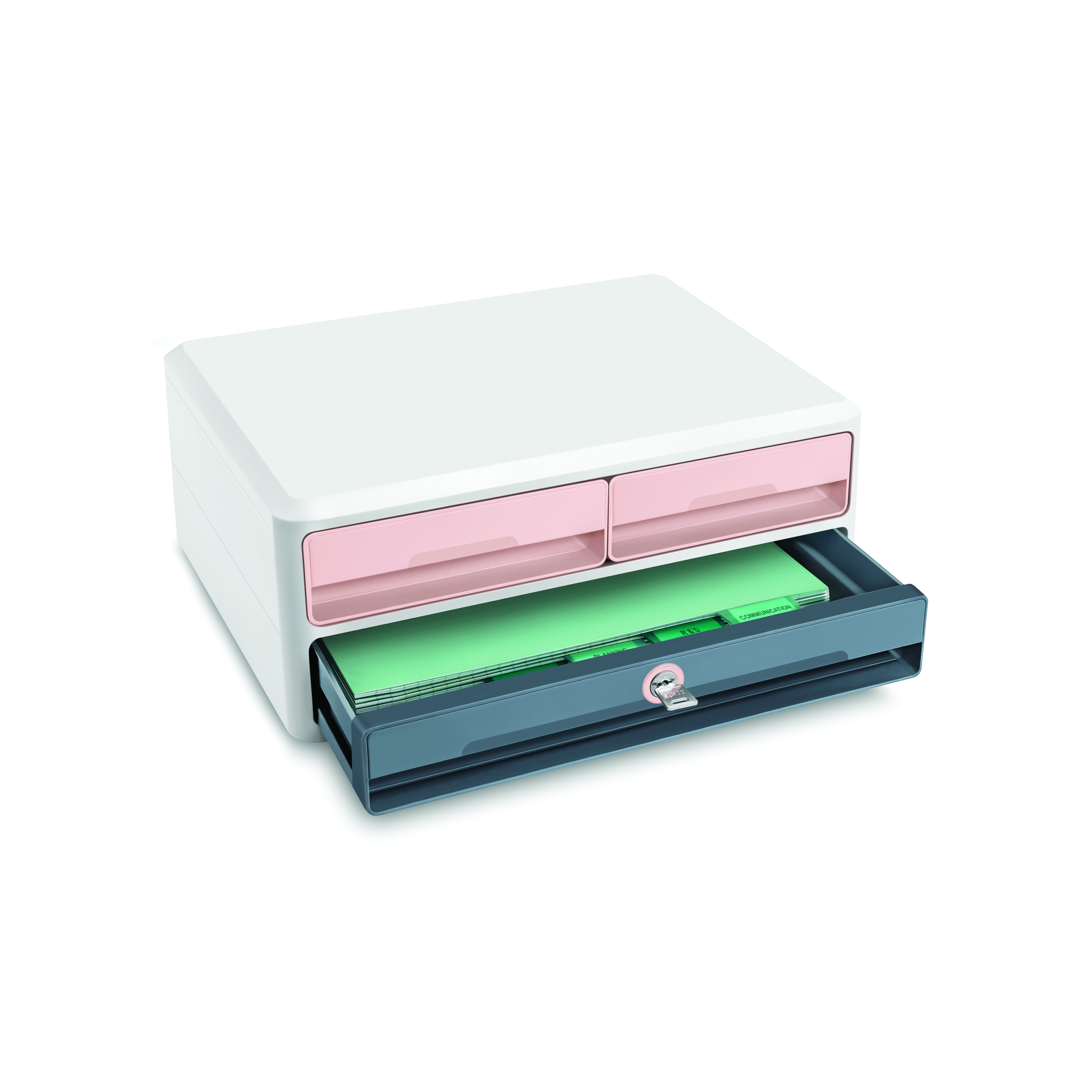 This agile module will suit home-working with an ultra robust monitor riser which helps to promote good posture. Featuring two half-drawers to store office supplies and computer accessories; plus one large drawer for documentation measuring up to 240x320mm; and, a tablet, computer or laptop measuring up to 14 inches. Made from 100% recyclable, high quality plastic, the station measures W370xD274xH146mm with a storage capacity of half- drawer (W245xD160 H40mm); and a large drawer (W328xD245xH40mm). The smooth sliding drawers with retaining stops are GDPR compliant, locking with a key to protect confidential documents and personal belongings; and, a security notch at the back which allows the installation of an anti-theft cable (not provided). Supplied in pink/grey.