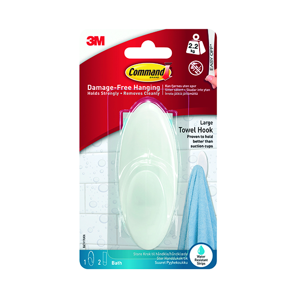 Easy to hang, the large Command towel hook with water resistant adhesive strips will hold on to most surfaces including glass, mirror, tile, fiberglass, wood and painted surfaces, supporting a weight capacity of up to 5lb. Easily removed without leaving holes or residue they can be used again with water resistant replacement strips. Supplied in a pack of 1 hook and 1 strip.