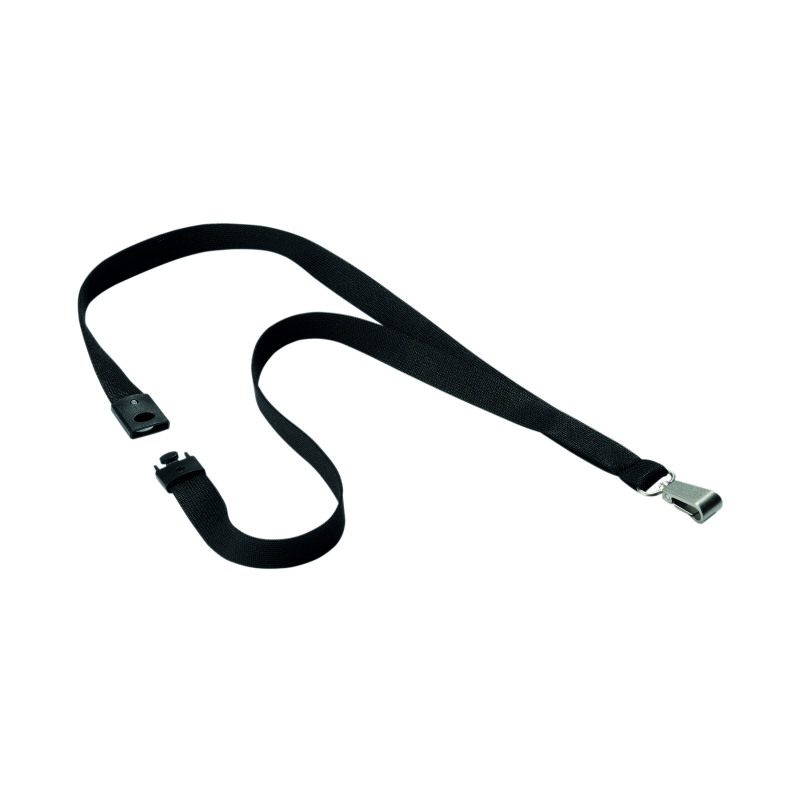 Durable premium black textile lanyard with metal snap hook and silky soft finish. The lanyard can be combined with every DURABLE name badge with punched holes. The lanyard has a safety release which opens should the lanyard become trapped or caught. The length of the lanyard is 440mm.