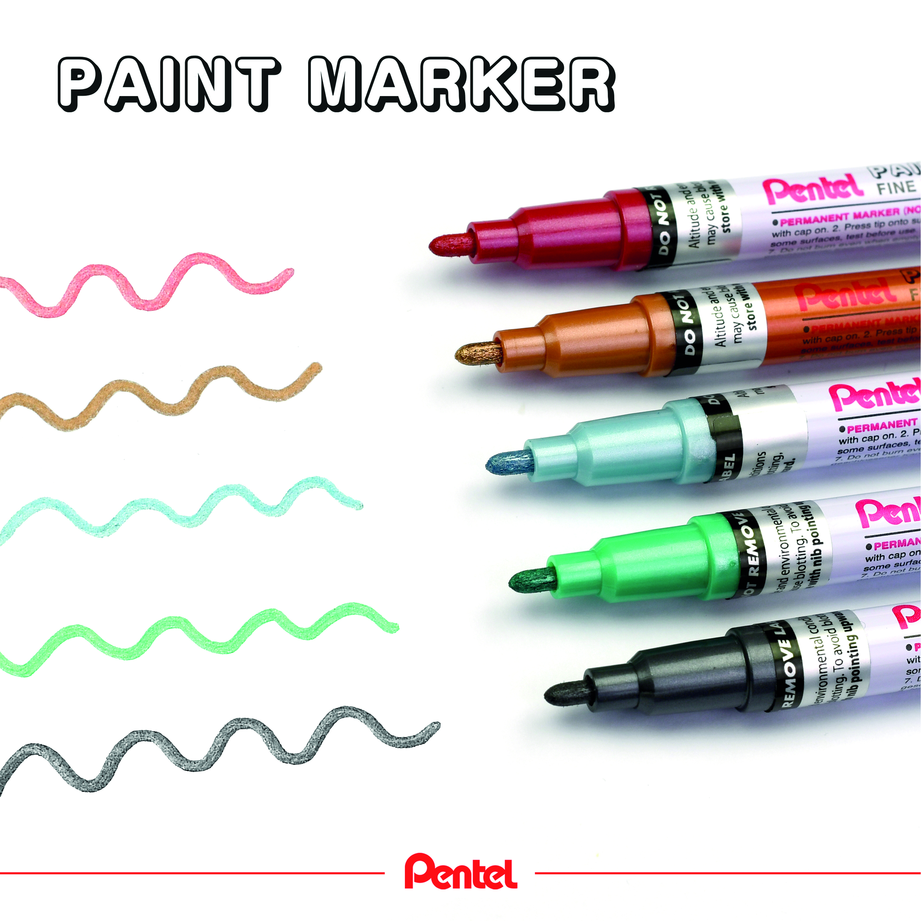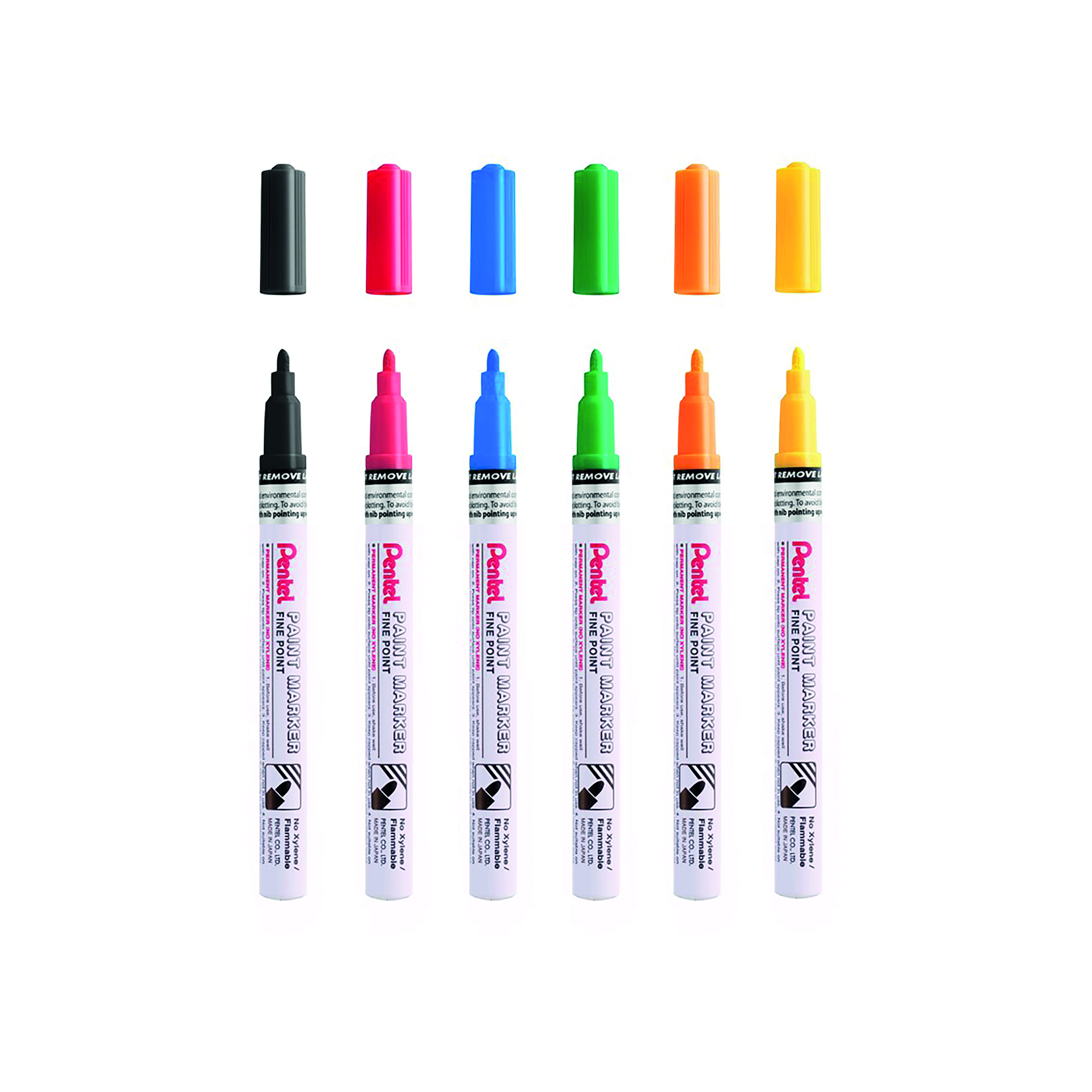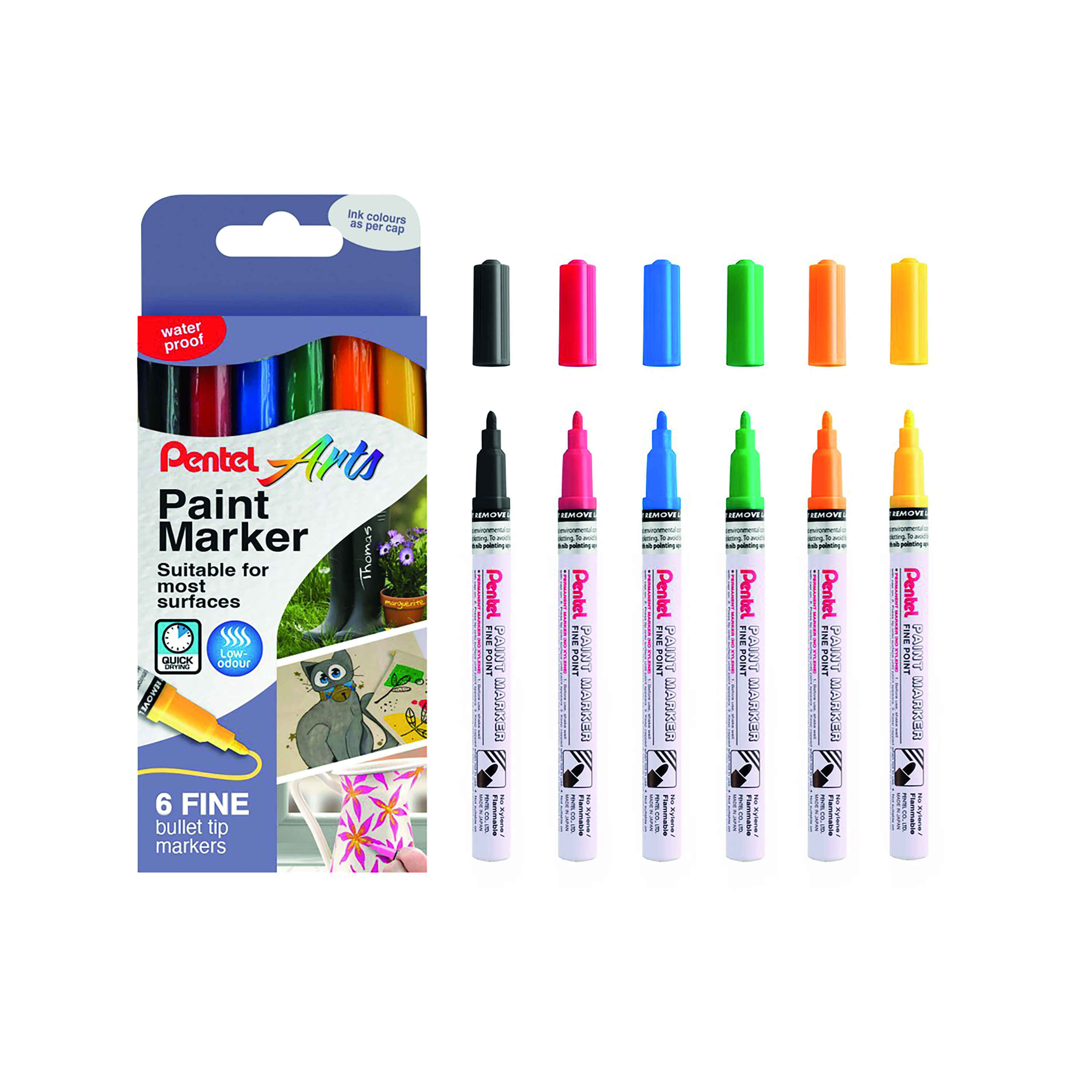 These Pentel Paint Markers are packed with opaque pigment-based Xylene-free ink that is effective on non-absorbent surfaces such as thick card, metal, glass, plastic or rubber. Producing a fine and opaque line that lasts longer even in sunlight, the fine bullet tip, combined with the valve-controlled flow is suitable for writing on most surfaces. Supplied in a pack of 6 markers with assorted ink colours.