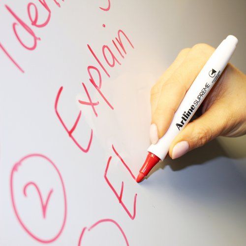 The Artline Supreme Whiteboard Marker is designed with a bullet-style nib that delivers a consistent 1.5mm writing width, ideal for clear, controlled lines. Its compact, lightweight barrel - finished in a sleek white design - is perfectly suited for smaller hands, making it comfortable and easy to grip for extended use. The marker produces vivid, highly visible colours that stand out clearly on any whiteboard surface. Ink is easily erasable with a dry cloth or eraser, leaving no residue behind, making it perfect for classrooms, offices, or home use. Reliable, user-friendly, mess-free and xylene free, this marker is a great choice for everyday use.