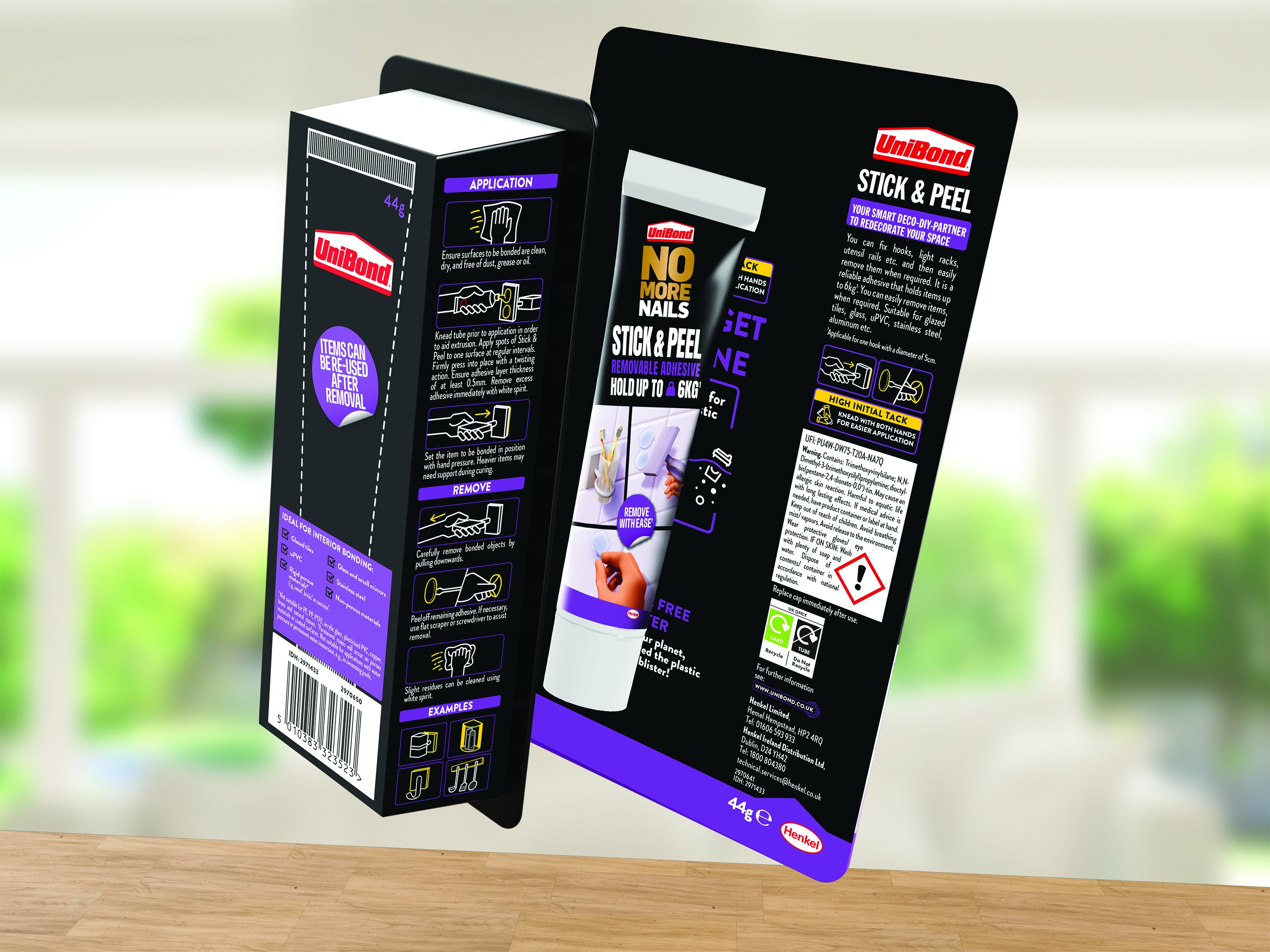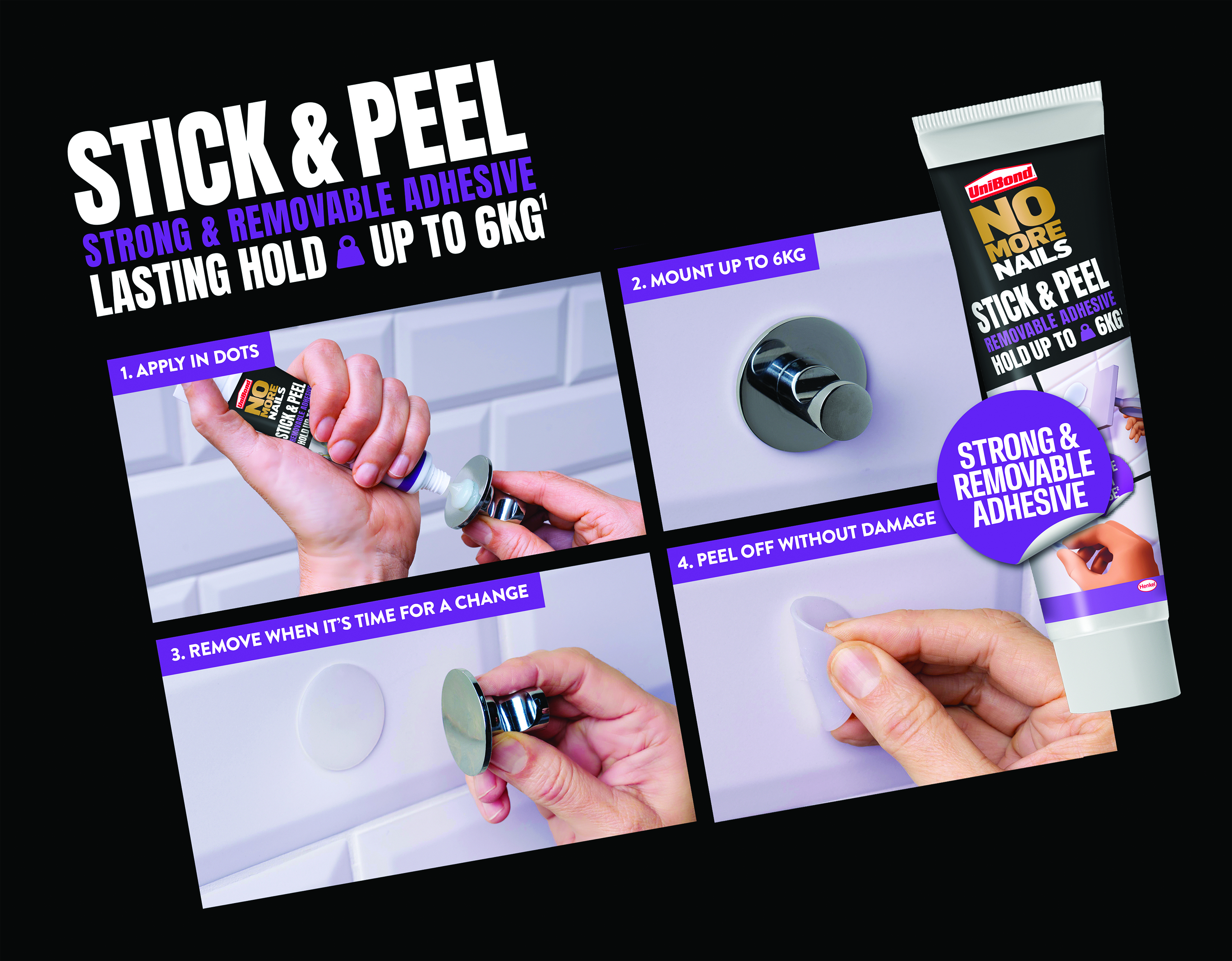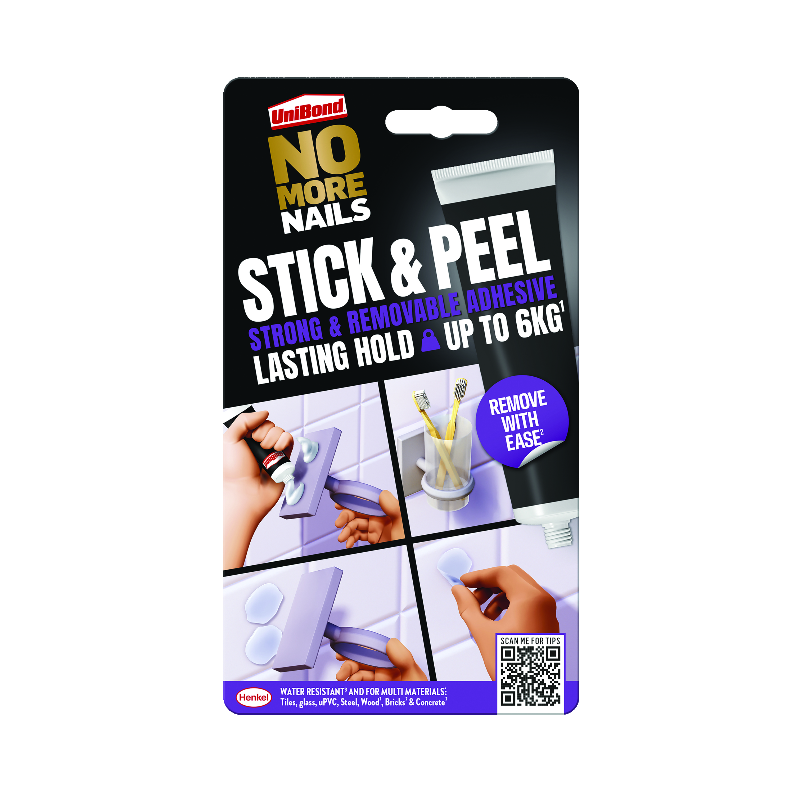 UniBond Stick and Peel is a strong, water resistant, adhesive which is non-permanent. Holding up to 6 kg, it is easy to remove when no longer needed. Ideal for use with one hook and a bond surface diameter of 5cm, this adhesive dries with a clear finish and can be adjusted up to 20 minutes. Supplied in a 44g tube.