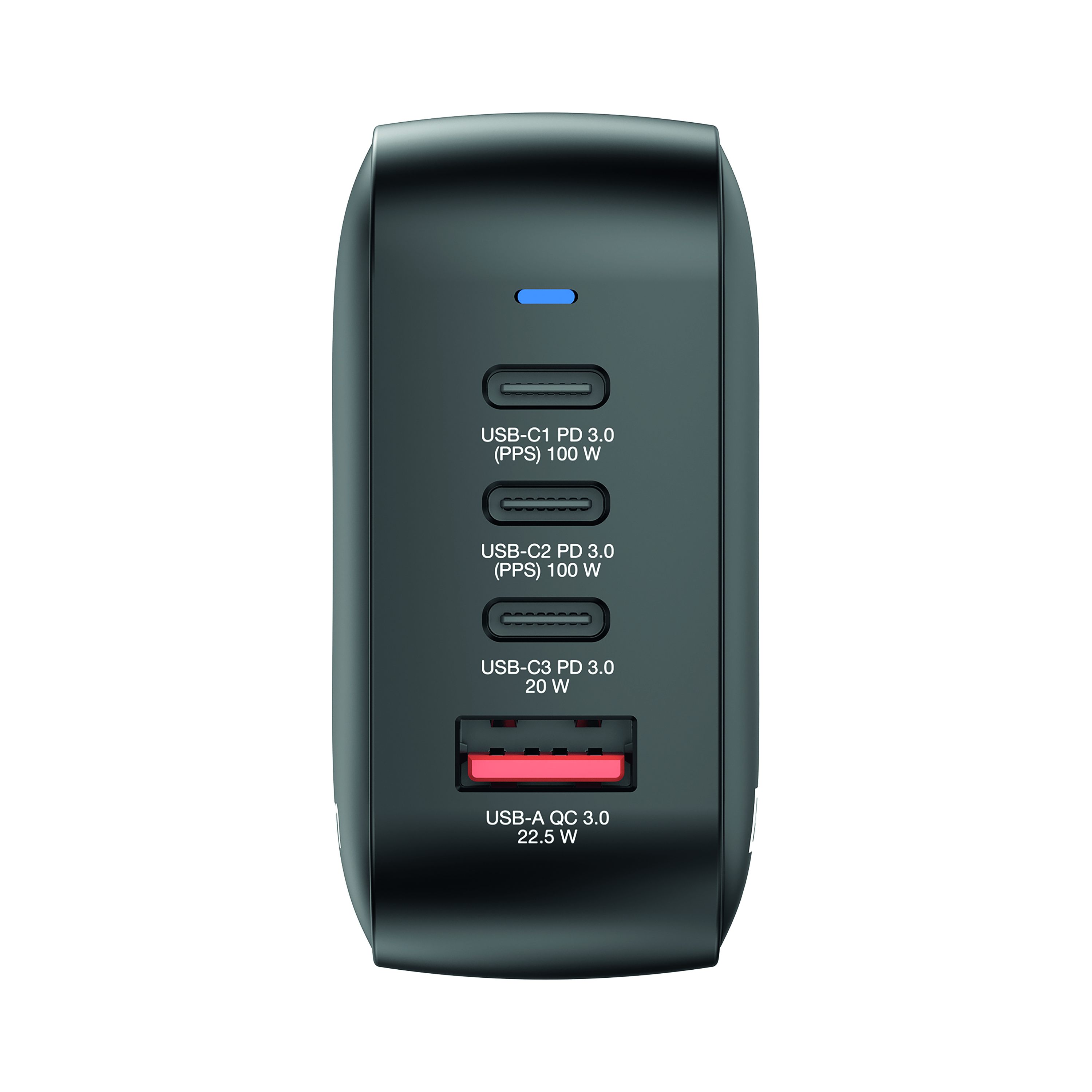 - 100W mini wall charger with 4 output ports: 2 x USB-C PD 100W, 1 x USB-C PD 20W and 1 x USB-A QC 3.0